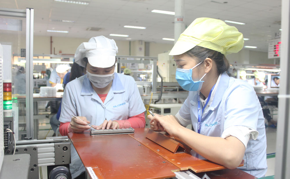Giá trị xuất khẩu sản phẩm điện thoại thông minh tháng 11 ước đạt 619,3 triệu USD, tăng 3,23% so với cùng kỳ. Trong ảnh: Hoạt động sản xuất tại Công ty TNHH Glonics Việt Nam, phường Phú Xá (T.P Thái Nguyên).