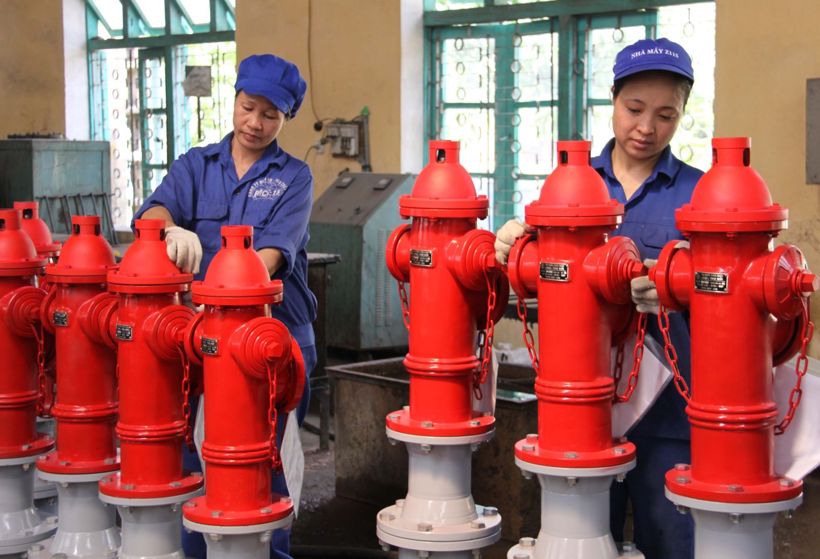 Công nhân Nhà máy Z115 kiểm tra mặt hàng trụ nước cứu hỏa trước khi xuất xưởng.