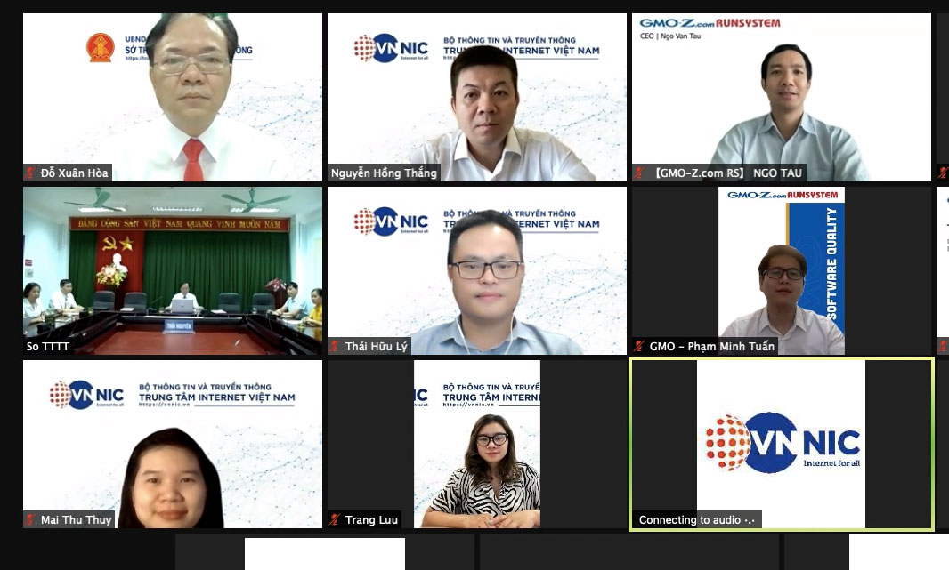 Sự kiện trực tuyến khai trương cổng đăng ký tên miền quốc gia “.vn” với sự tham gia của VNNIC, Sở TT&TT Thái Nguyên, NĐK GMO-Z.com RunSystem và đại diện một số khách hàng đã được chương trình hỗ trợ (1/9/2021). Ảnh: Sở TT&TT Thái Nguyên.