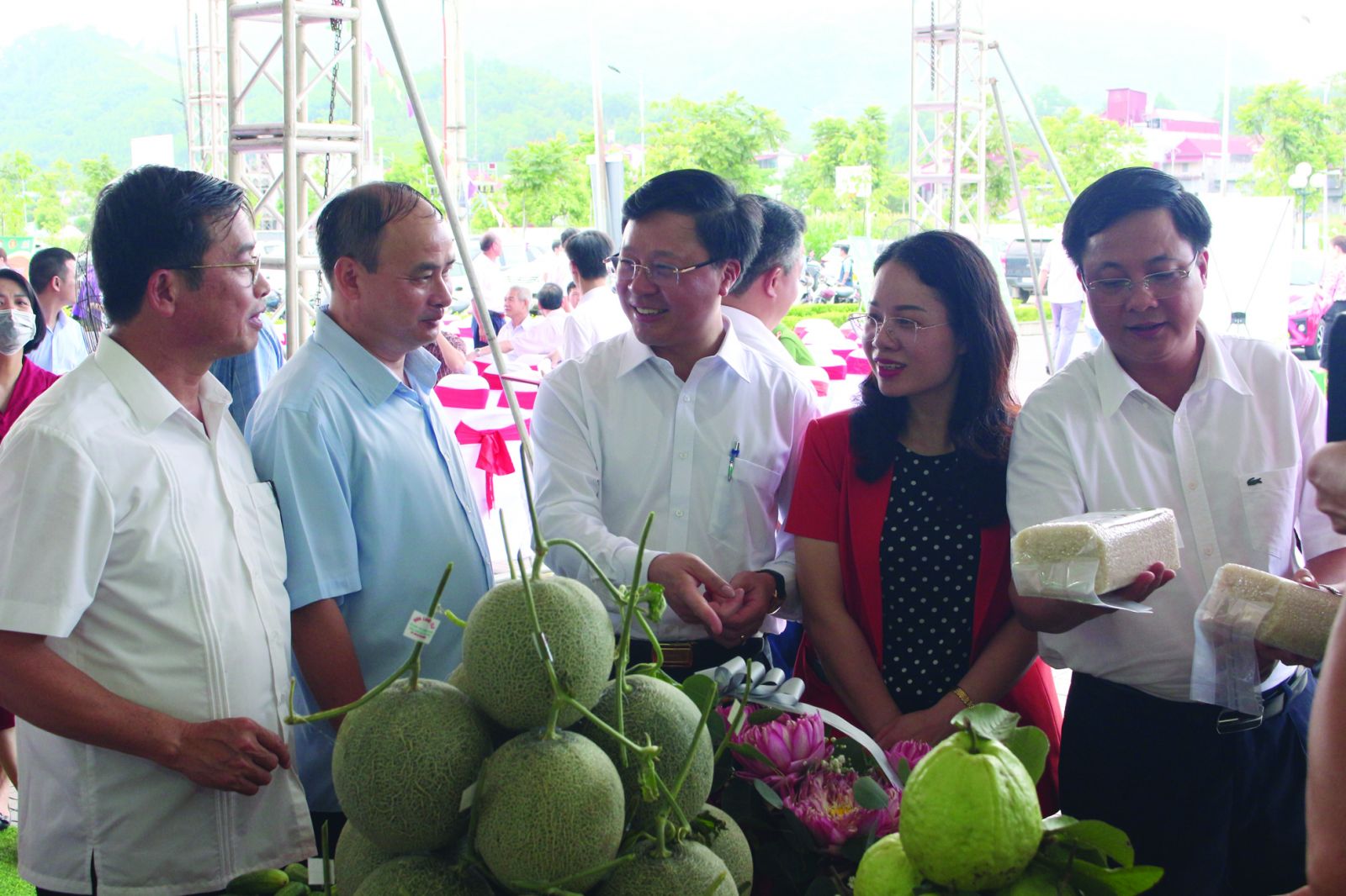 Lãnh đạo Sở Công thương tỉnh Thái Nguyên và huyện Võ Nhai tham quan các gian hàng nông sản Võ Nhai