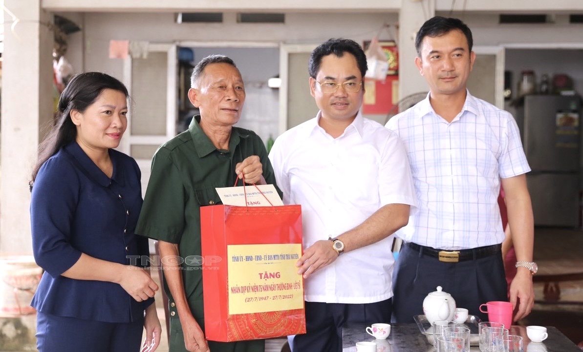 Phó Bí thư Tỉnh ủy, Chủ tịch UBND tỉnh Thái Nguyên, Trịnh Việt Hùng và các thành viên trong Đoàn tặng quà bệnh binh Đào Huy Cận, xóm Khuôn 3, xã Phục Linh (huyện Đại Từ)