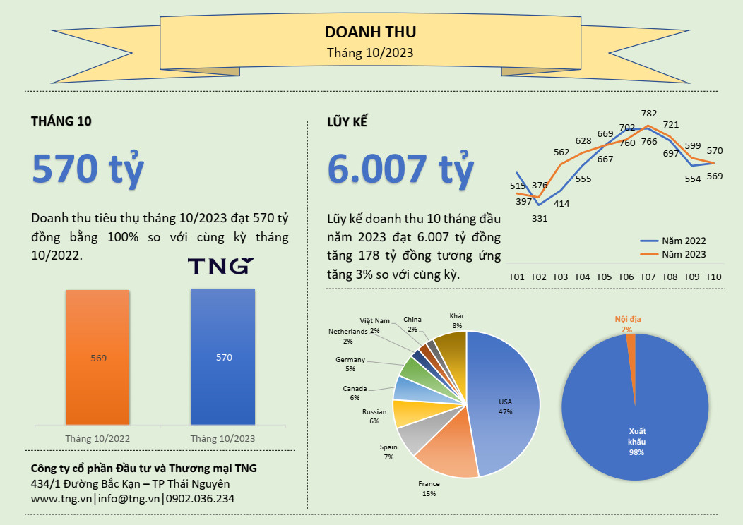 TNG: DOANH THU TIÊU THỤ THÁNG 10/2023 ĐẠT 570 TỶ ĐỒNG