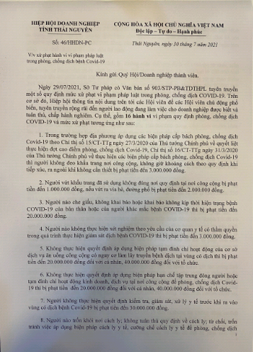 Ngày 29/07/2021, Sở Tư pháp có Văn bản số 903/STP-PB&TDTHPL tuyên truyền một số quy định mức xử phạt vi phạm pháp luật trong phòng, chống dịch COVID-19. Trên cơ sở đó, Hiệp hội thông tin nội dung trên tới các Hội viên để các Hội viên chủ động phổ biển, tuyên truyền rộng rãi đến người lao động đang làm việc cho doanh nghiệp được biết và tuân thủ, chấp hành nghiêm. Cụ thể, gồm 16 hành vi vi phạm quy định phòng, chống dịch COVID-19 và mức xử phạt tương ứng như sau: